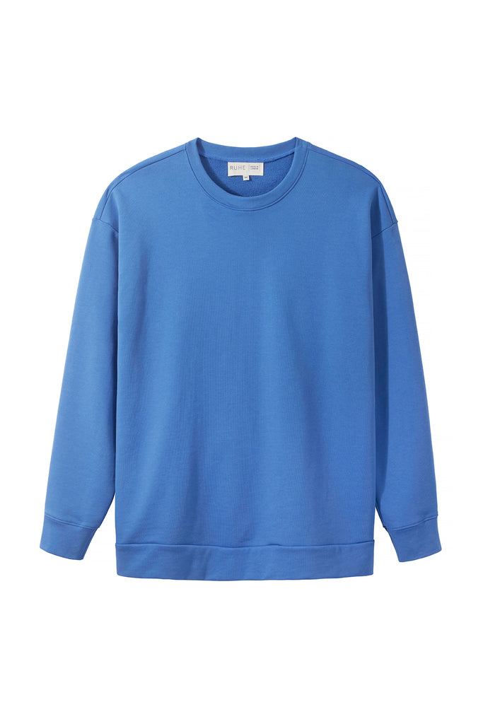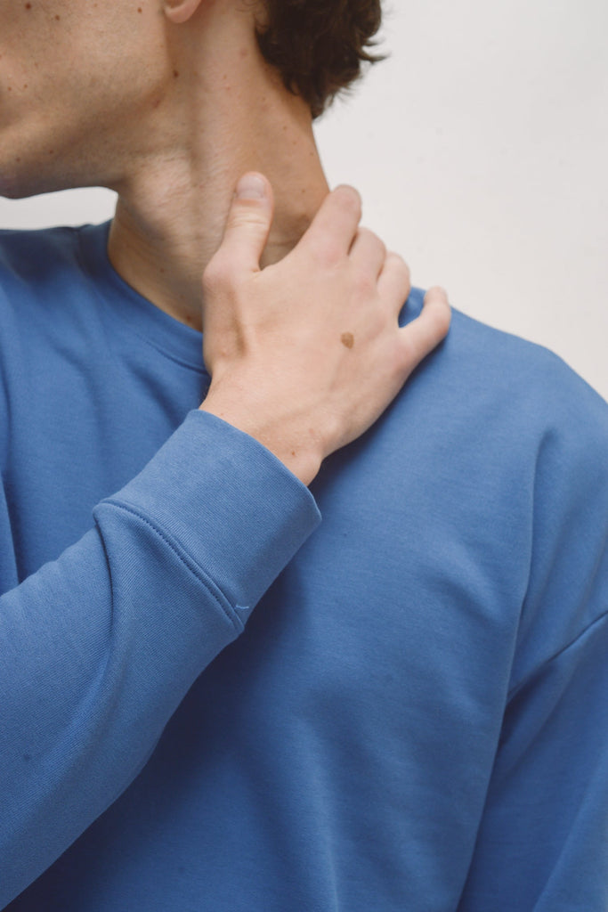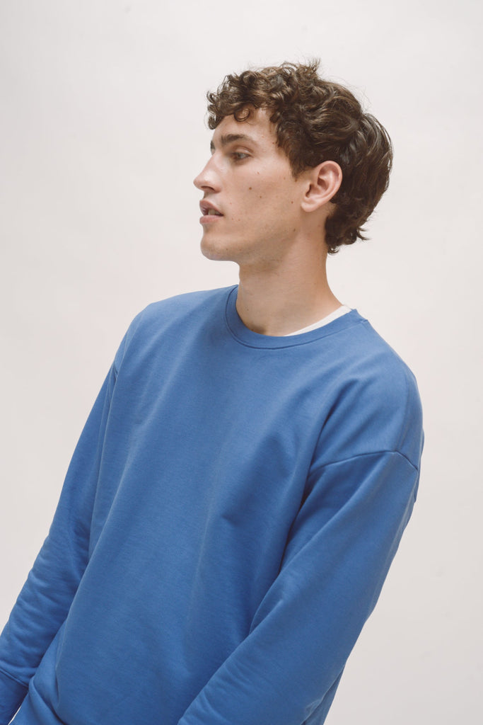 The Blu Sweatshirt in blue is a gender-free design, cut with an oversized fit and dropped shoulder. This wardrobe essential is crafted from 100% organic cotton and responsibly made in small batches in a family-run production house in London.