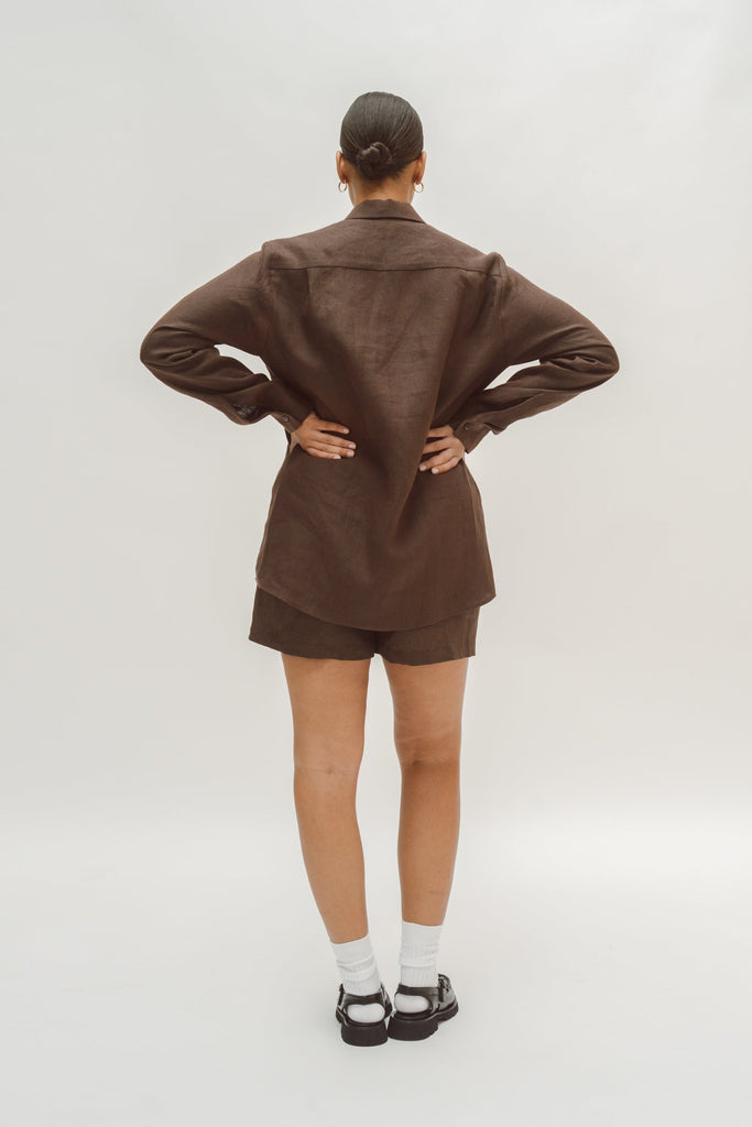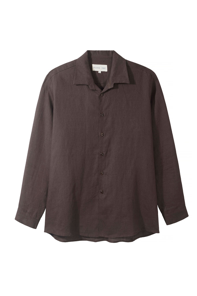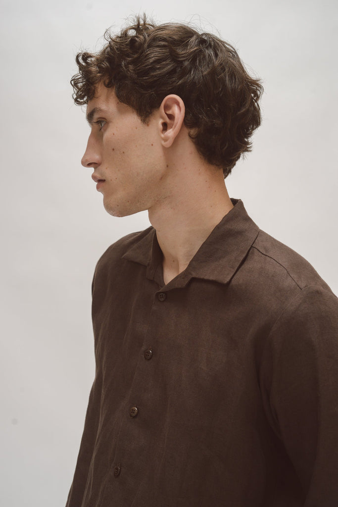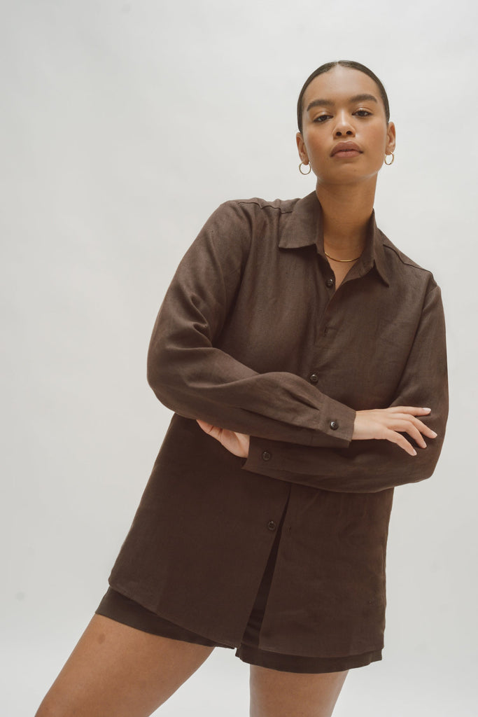 The Rudi Shirt in brown is designed with an oversized, loose fit, making it a comfortable staple piece for everyday wear. This genderless design is cut from medium-weight 100% OEKO-TEX® 100-certified linen and closes with sustainably-sourced Corozo buttons. It was responsibly made in small batches in a family-run production house in London.