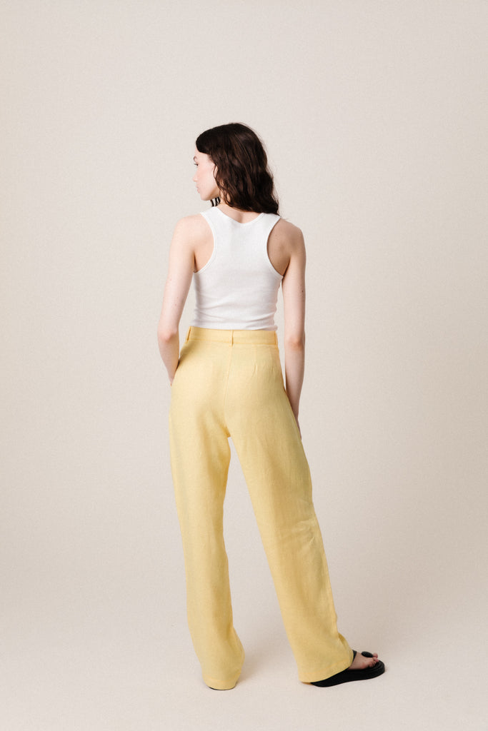 The Raffi Trouser in Butter are a pair of tailored, high-waisted trousers. Full length, with a fitted waist and relaxed leg. A wardrobe staple in 100% EKO Certified linen. Each pair was responsibly made in small batches in a family-run production house based in London.