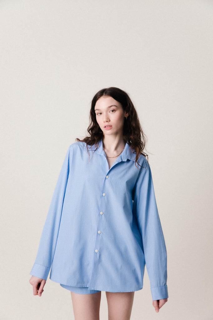 The Rudi Shirt in Organic Cotton, Blue Stripe, is designed with an oversized, loose fit, making it a comfortable staple piece for everyday wear. This genderless design is cut from 100% organic cotton and closes with sustainably-sourced Corozo buttons. It was responsibly made in small batches in a family-run production house in London.