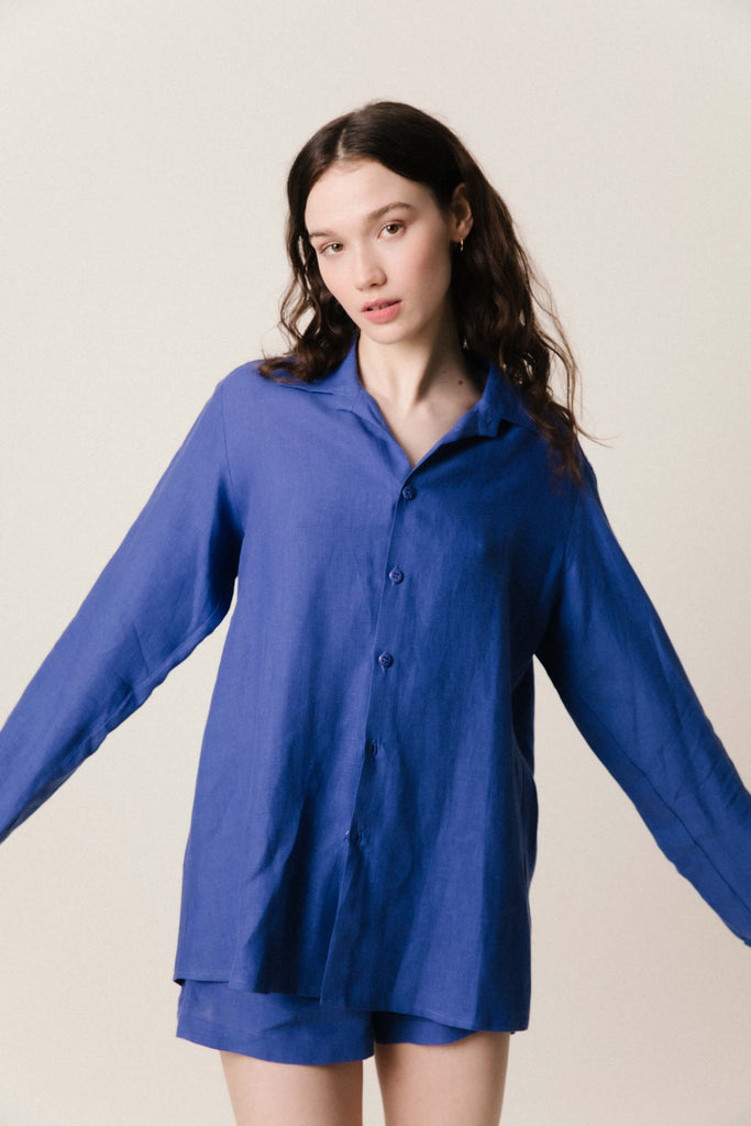 The Rudi Long Sleeve Shirt in Cobalt Blue is designed with an oversized, loose fit, making it a comfortable staple piece for everyday wear. This genderless design is cut from 100% Masters Of Linen, Belgian linen and closes with sustainably sourced Corozo buttons. It was responsibly made in small batches in our family-run production house based in London.